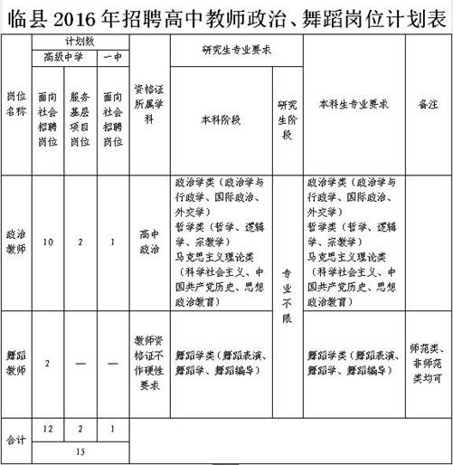 附:臨縣2016年招聘高中教師政治、舞蹈崗位計劃表