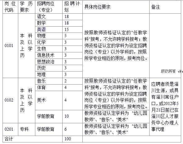 招聘崗位(專業(yè))及有關(guān)具體要求,詳見《2012年淄川區(qū)教體系統(tǒng)事業(yè)單位公開招聘教師計(jì)劃表》(附件)。