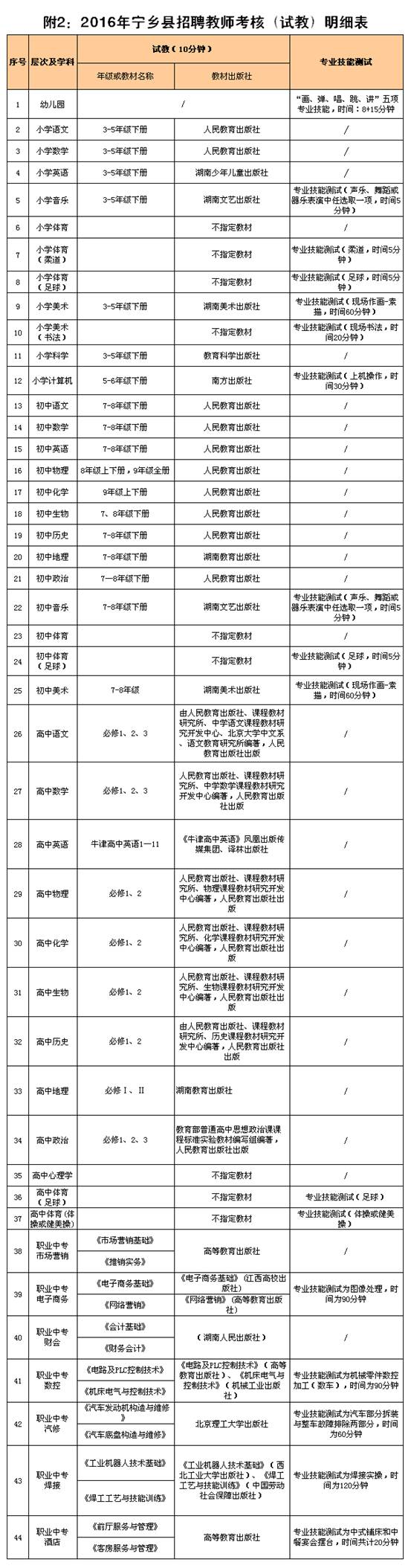 根據(jù)《寧鄉(xiāng)縣2016年公開(kāi)招聘中小學(xué)和幼兒園教師公告》規(guī)定,寧鄉(xiāng)縣2016年公開(kāi)招聘中小學(xué)和幼兒園教師(含衛(wèi)計(jì)學(xué)前教育)考核(試教、專業(yè)技能測(cè)試)定于2016年5月29日在寧鄉(xiāng)縣玉潭鎮(zhèn)中心小學(xué)(寧鄉(xiāng)縣玉潭鎮(zhèn)春城北路)進(jìn)行,請(qǐng)各位通過(guò)資格復(fù)審(資格復(fù)審時(shí)間為2016年5月26日)入圍考核(試教)的考生攜帶有效居民身份證、考核通知(資格復(fù)審時(shí)發(fā)放)于5月29日上午7:00前到達(dá)寧鄉(xiāng)縣玉潭鎮(zhèn)中心小學(xué)升旗坪集合,參加考核。參加音、體、美、幼兒園教師崗位考生需自帶相關(guān)專業(yè)技能測(cè)試用品。請(qǐng)各位考生作好自身準(zhǔn)備并按時(shí)參加,遲到即視同放棄考核資格。