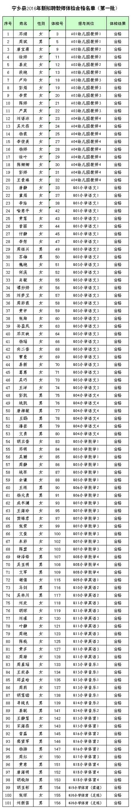 經組織體檢,下列人員體檢合格,進入考察程序,現予公示。請入圍考察人員于7月5日至7日攜帶本人身份證到寧鄉縣教育局314室辦理調檔手續。