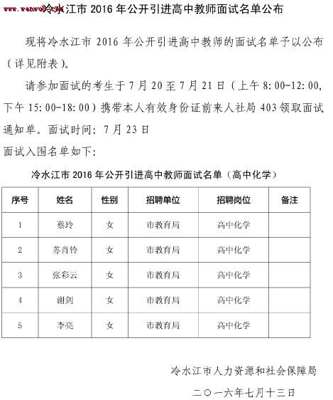 湖南省冷水江市2016年公開引進高中教師面試名單公布
