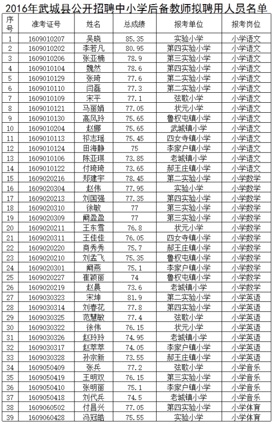 根據根據《2016年武城縣公開招聘中小學后備教師公告》規定,經網上報名、筆試、資格審查、面試、考察、體檢等程序,現將擬聘用人員予以公示,公示期為7個工作日(10月8日—10月14日)。
