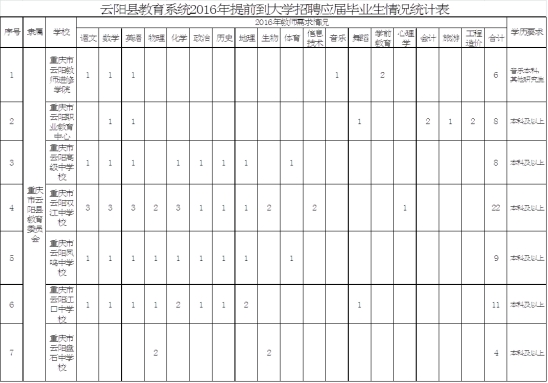 云陽縣教育委員會2016年西南大學專場招聘會 時間:10月17日上午8:30。 流程:宣講會-收簡歷-面試。 材料:組織機構代碼證,招聘需求,報名登記表見附件。 聯系人:向東,聯系電話:13996681399