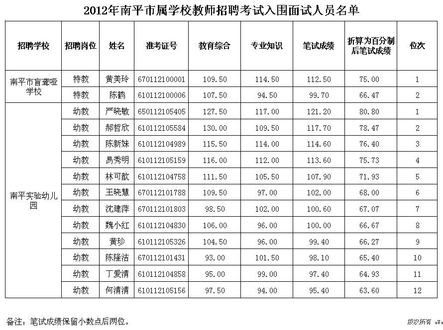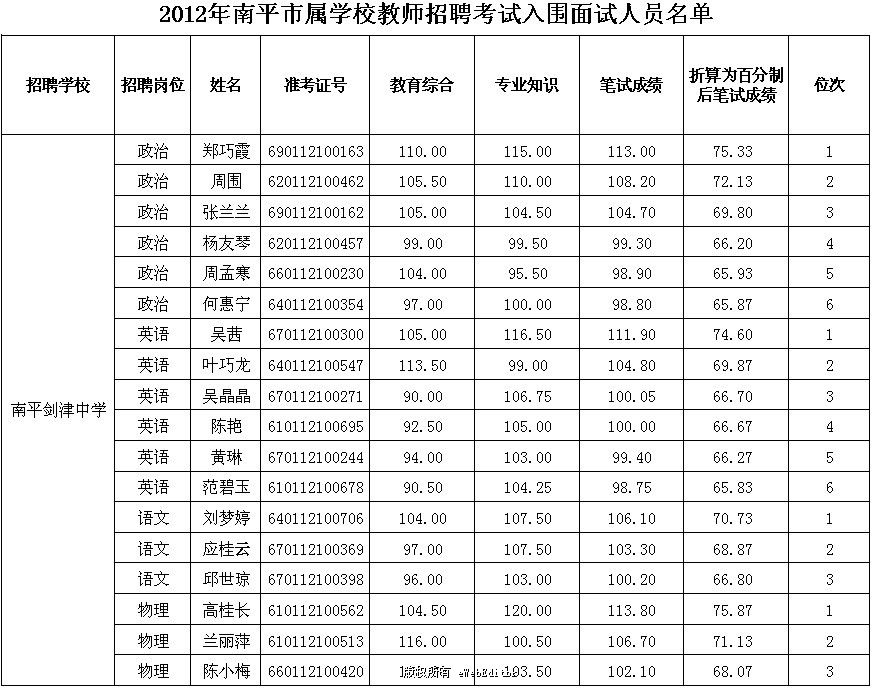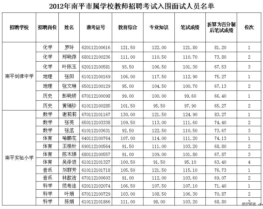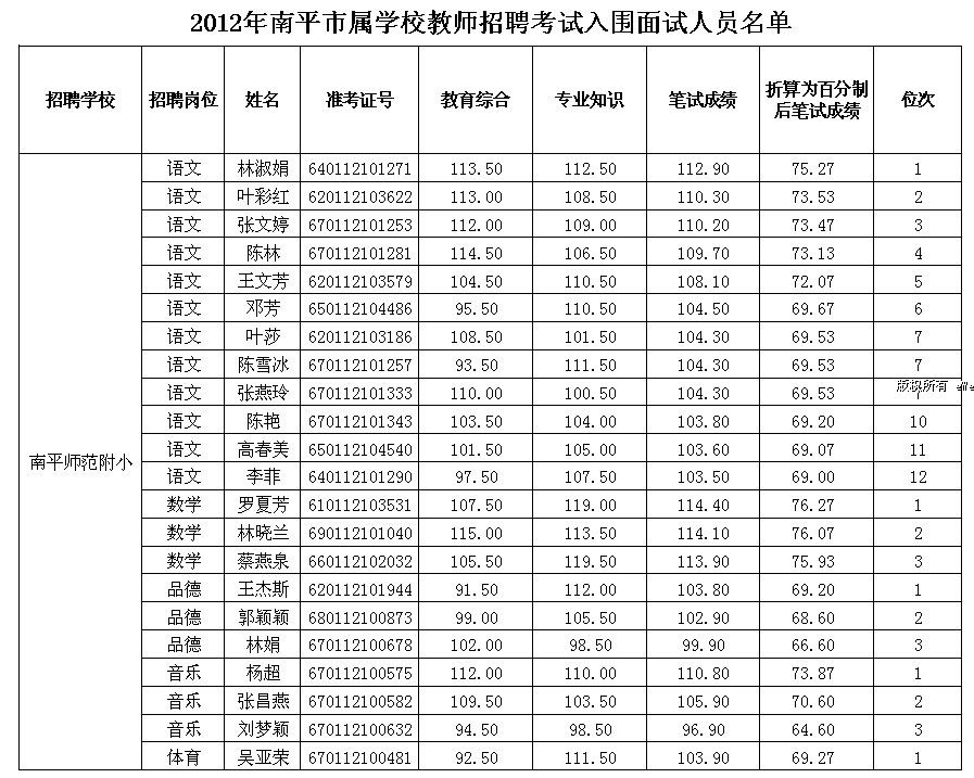 福建省南平市屬五所學校2012年教師招聘入圍面試人員名單公告
