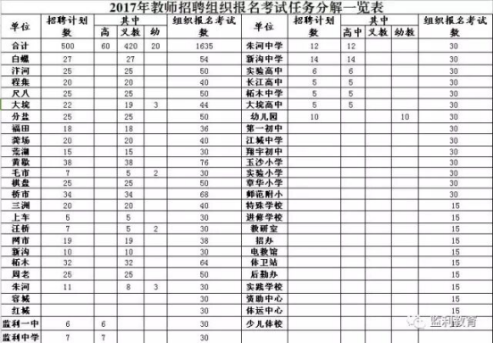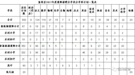 我縣2017年面向社會公開招聘500名中小學教師,其中高中教師60名、初中教師40名、小學教師380名、幼兒園教師20名。