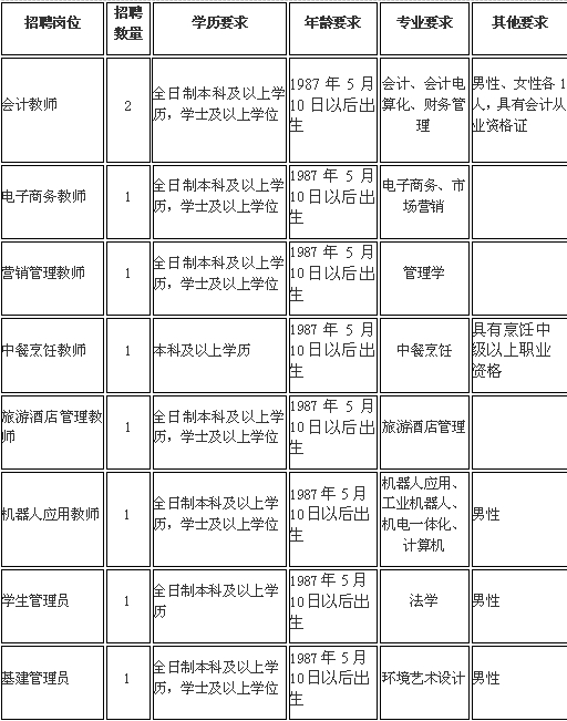 2、會(huì)計(jì)、電子商務(wù)、營(yíng)銷管理、旅游酒店管理、烹飪、機(jī)器人應(yīng)用專業(yè)教師采取試教+綜合面試的方式進(jìn)行。
