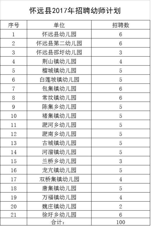 附件一:懷遠縣2017年幼兒教師招聘計劃表