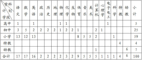 鄂州市2017年市直學校面向社會公開招聘教師100人,各學段學科招聘崗位如下: