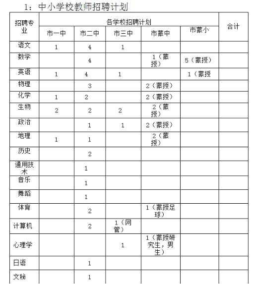 鄂爾多斯市教育局、市人力資源和社會保障局、市機構編制委員會辦公室為市直屬九所學校(鄂爾多斯市第一中學、鄂爾多斯市第二中學、鄂爾多斯市第三中學、鄂爾多斯市蒙古族中學、鄂爾多斯市蒙古族學校、鄂爾多斯市特殊學校、鄂爾多斯市衛生學校、鄂爾多斯市理工學校、內蒙古民族幼兒師范高等專科學校)公開招聘教師。市教育局、市人社局、市編辦及市直有關學校組成招聘工作領導小組,負責教師招聘工作。