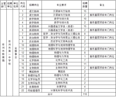 按照中共山西省委組織部、山西省人力資源和社會保障廳《關于進一步改進和加強事業單位公開招聘工作的意見》(晉人社廳發〔2017〕35號)和《關于做好2017年全省事業單位公開招聘人員工作的通知》(晉人社廳發〔2017〕37號)等文件精神,根據招聘計劃和招聘單位編制、崗位空缺情況,經市政府研究決定,擬為忻州市第一中學招聘教師110名。現公告如下:
