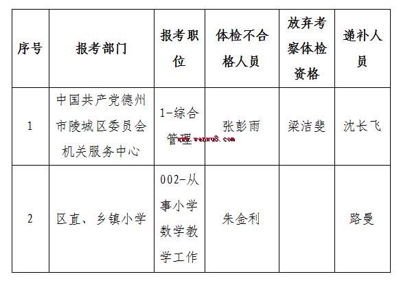 根據《2018年德州市陵城區事業單位公開招聘工作人員簡章》、《2018年德州市陵城區公開招聘教師簡章》、《關于做好2018年陵城區事業單位公開招聘工作人員考察工作的通知》、《2018年德州市陵城區事業單位公開招聘工作人員考察遞補和體檢通知》和《2018年德州市陵城區公開招聘教師考察遞補和體檢通知》相關規定,現將考察體檢遞補人員公告如下: