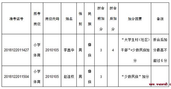 根據《攀枝花市東區人力資源和社會保障局攀枝花市東區教育體育局關于2018年下半年公開考試招聘中小學教師公告》規定,已于2018年12月13日—2018年12月17日對少數民族考生、基層服務項目考生、退役大學生士兵考生加分情況予以了公示。