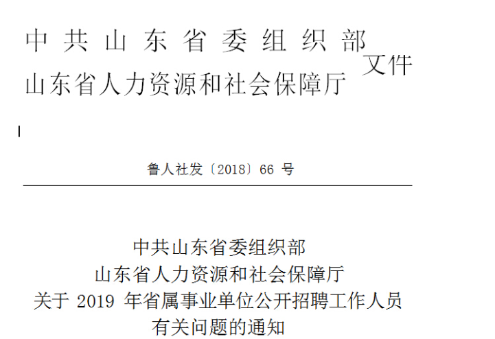 為切實做好 2019 年省屬事業單位工作人員公開招聘工作,根據《事業單位人事管理條例》(國務院令第 652 號)、《事業單位公開招聘人員暫行規定》(人事部令第 6 號)和《山東省事業單位公開招聘工作規程》(魯人社發〔2015〕6 號)等有關規定,現就有關問題通知如下: