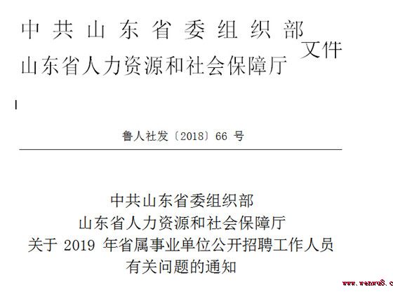 為切實做好 2019 年省屬事業單位工作人員公開招聘工作,根據《事業單位人事管理條例》(國務院令第 652 號)、《事業單位公開招聘人員暫行規定》(人事部令第 6 號)和《山東省事業單位公開招聘工作規程》(魯人社發〔2015〕6 號)等有關規定,現就有關問題通知如下: