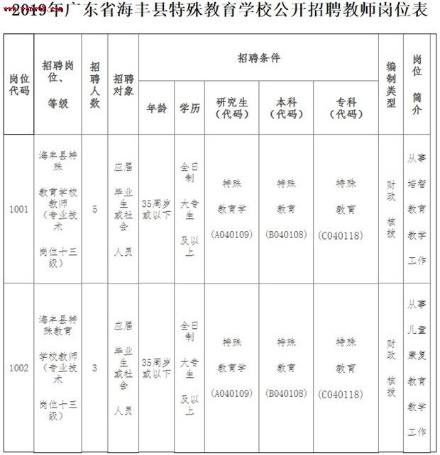 2019年廣東汕尾海豐縣特殊教育學校招聘專任教師公告【8人】