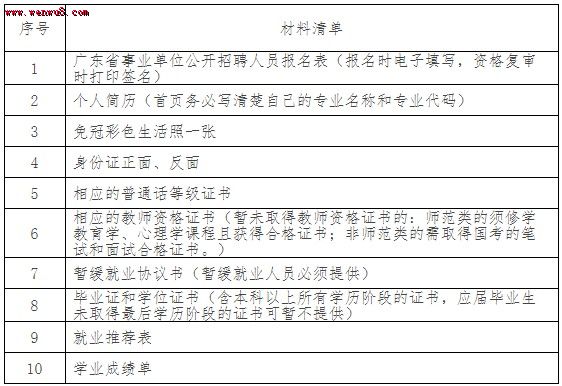 2.應聘人員填寫《廣東省事業單位公開招聘人員報名表》,個人簡歷,連同本人免冠彩色生活照(原圖)、身份證、普通話等級證書、教師資格證書或“兩學(教育學、心理學)”合格證(成績單)、畢業證書、學位證書、就業推薦表、學業成績單及其他相關材料掃描成彩色電子版,并嚴格按下表材料清單順序把所有材料打包在同一個PDF文檔中,不按要求報名者一律不予受理。