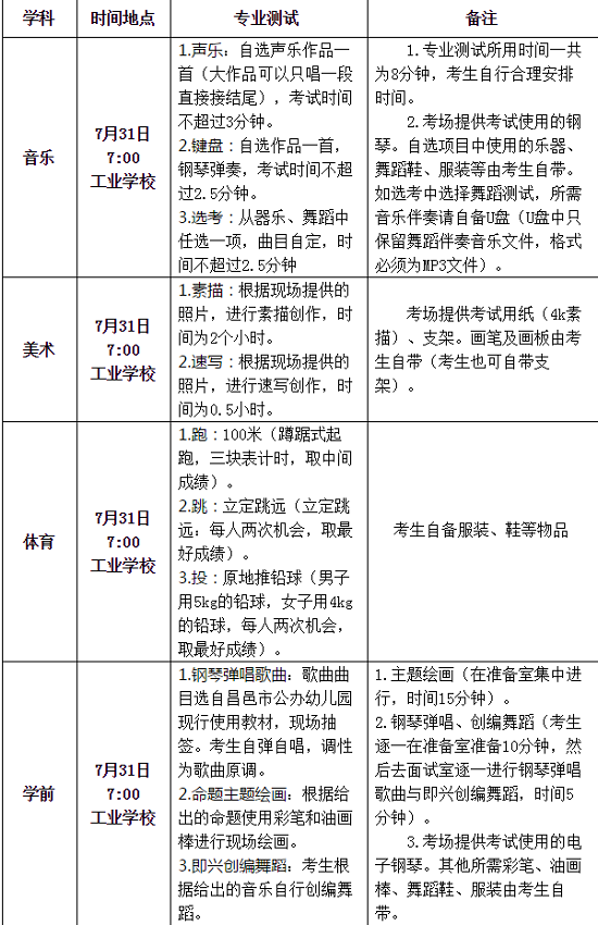 音樂(含技工學(xué)校)、體育(含技工學(xué)校)、美術(shù)、學(xué)前(含技工學(xué)校)4個(gè)學(xué)科專業(yè)測(cè)試內(nèi)容及要求如下: