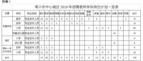 1.周口市中心城區2019年招聘教師學科崗位一覽表