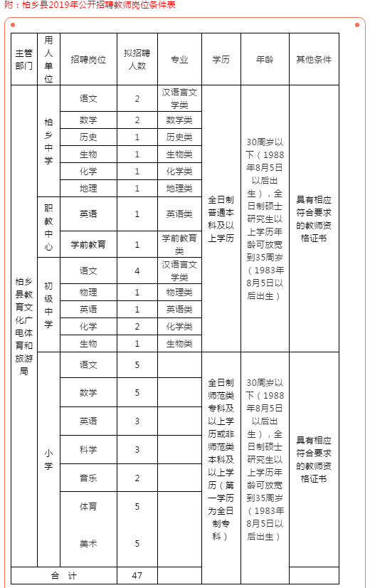 本次公開招聘教師共計47名,其中招聘高中教師8名、中等職業學校教師2名、初中教師9名和小學教師28名。