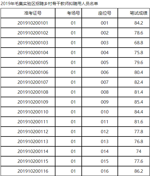 根據《2019年毛集實驗區招聘鄉村骨干教師公告》等文件規定,2019年毛集實驗區招聘鄉村骨干教師(16人)工作已完成統一筆試、體檢、考察等程序,現將2019年毛集實驗區招聘鄉村骨干教師擬聘用人員名單(見附件)予以公示。