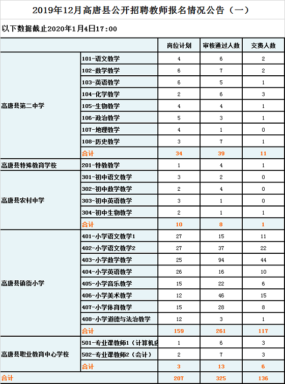山東教師招聘 聊城高唐縣2019年12月招聘教師報名情況公告(一)