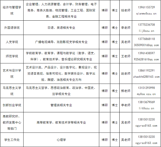 有意應聘者,請將個人簡歷、有關教學、科研業績材料及家庭情況發送至各二級學院聯系人郵箱或人事處郵箱:cgyrsc 163.com,發送主題請以"姓名+專業+學歷(職稱)+高校人才網"格式注明。