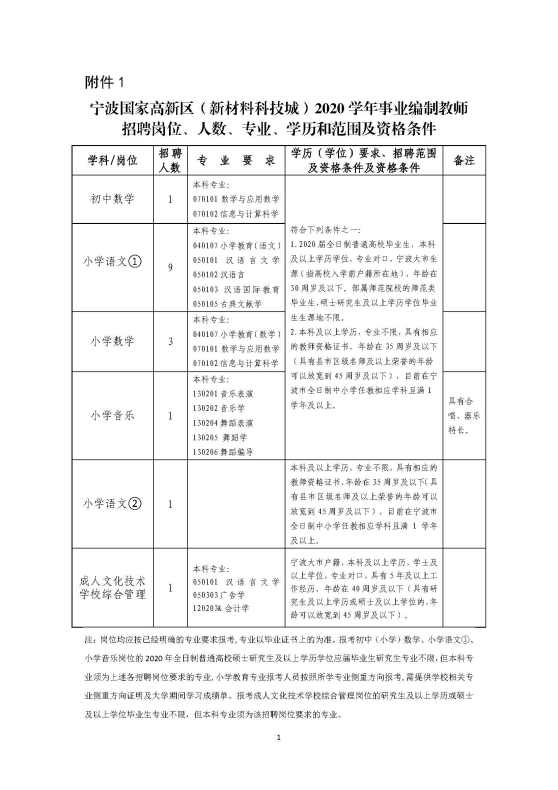1.寧波國(guó)家高新區(qū)(新材料科技城)2020學(xué)年事業(yè)編制教師招聘崗位、人數(shù)、專業(yè)、學(xué)歷和范圍及資格條件