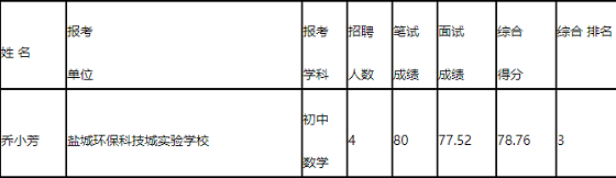 2019年亭湖區公開招聘教師中,報考鹽城環?萍汲菍嶒瀸W校初中數學學科的喬小芳考生因懷孕生產延遲部分體檢項目。根據有關規定,完成體檢所有項目并合格后方可進入考察程序。該考生已完成體檢全部項目且考察均合格,現予以公示。