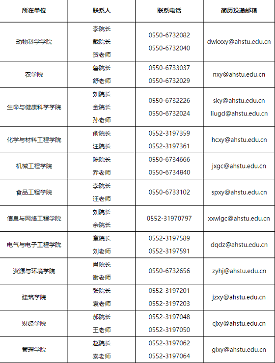 人事處聯系人:常老師張老師;電話:0550-6732257;地址:安徽省鳳陽縣東華路9號;郵編:233100;電子郵箱:rsc@ahstu.edu.cn;單位主頁網址:http://www.ahstu.edu.cn。