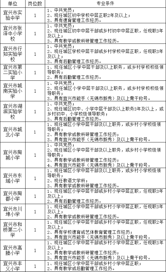 宜興市實驗中學等17所學校(幼兒園)的20個校級副職崗位,詳見“競聘條件”。