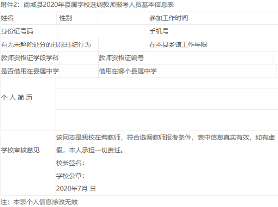 3.報名要求:凡符合條件的人員報名時需持《南城縣2020年縣屬學校選調教師報考人員基本信息表》、本人身份證、教師資格證及近期一寸免冠照片1張。