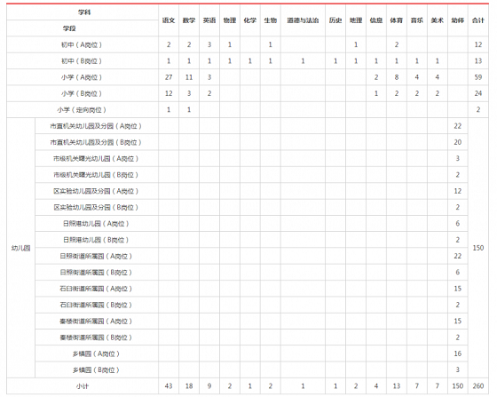 本次計劃招聘教師260名,其中初中教師25名、小學教師85名、幼兒園教師150名。具體招聘崗位、人數見下表。
