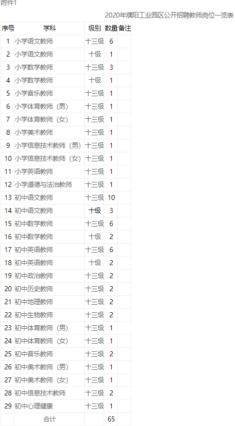 附件1:2020年濮陽工業園區公開招聘教師崗位一覽表