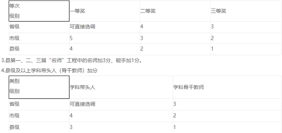 其計分標準為國家級、省級、市級、縣級分別加5分、4分、3分、2分,計分范圍為優秀教師、優秀班主任、優秀教育工作者(德育)、模范教師、師德標兵、優秀校長、優秀黨員(黨務工作者)等。