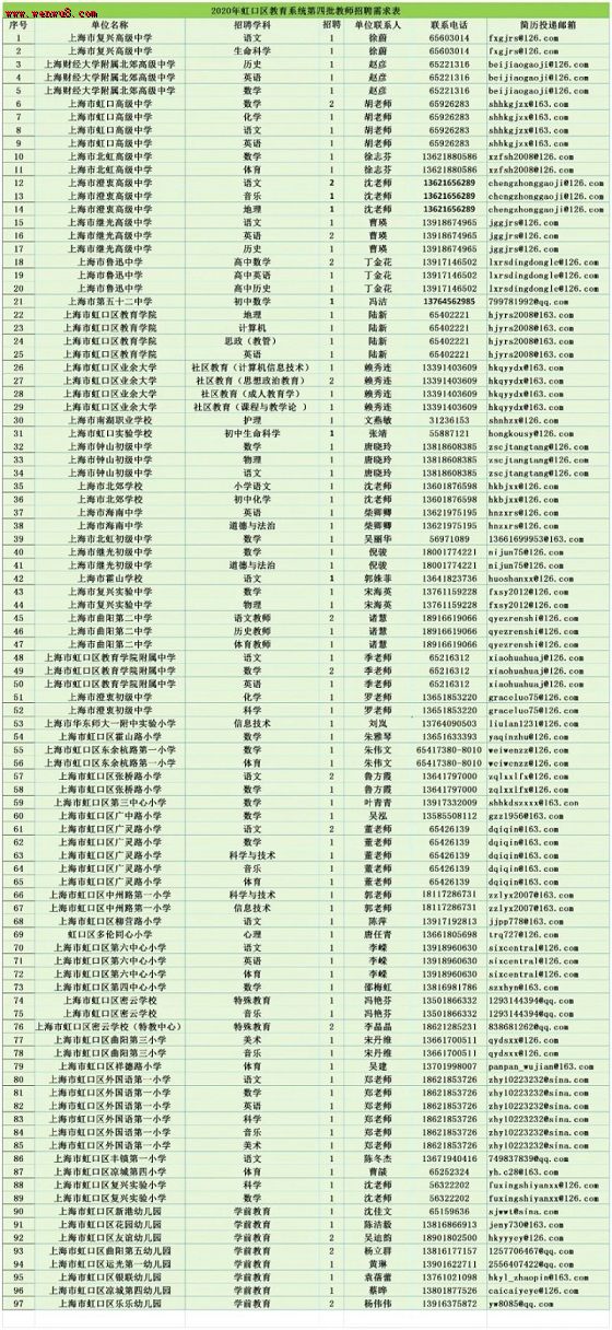 2020年上海教師招聘 上海虹口區教育系統第四批教師招聘公告【110人】