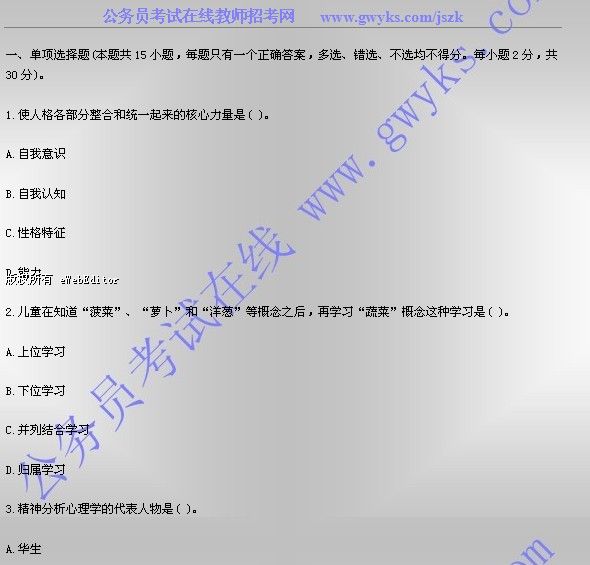 10.B[解析]培根根據智力、情感、意志等三種心理機能把人的性格分為理智型、情緒型和意志型。榮格根據個人心理活動傾向把人的性格分為內向型和外向型。阿德勒根據獨立和順從的程度把人的性格分為獨立型和順從型。
