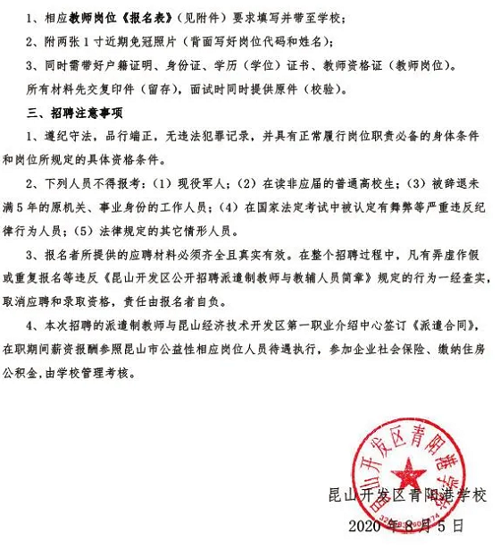 2020年蘇州教師招聘 昆山開發(fā)區(qū)青陽港學(xué)校公開招聘派遣制教師公告