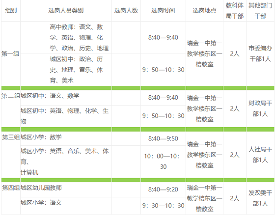 請選崗人員于8月20日上午按下表分組安排,帶好本人身份證,提前20分鐘到瑞金一中第一教學樓東區一樓教室參加選崗。