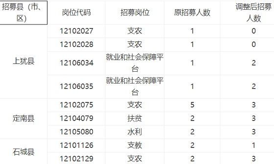 根據《2020年江西省高校畢業生“三支一扶”計劃招募公告》關于“服務崗位的招募計劃數與報名人數不低于1:2的比例”要求,凡服務崗位招募計劃數與報名人數低于1:2比例的,可由設區市“三支一扶”工作辦公室調劑,經省“三支一扶”工作辦公室同意,根據考生報名情況,現將相關招募崗位計劃調整如下: