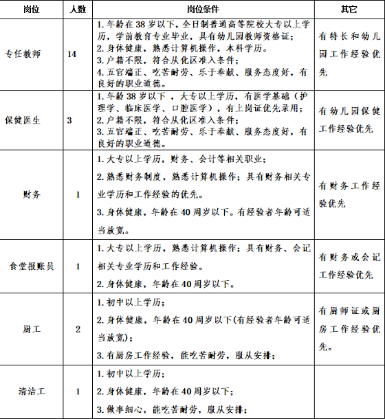 (一)招聘崗位:專任教師、保健醫(yī)生、后勤人員(財(cái)務(wù)、食堂報(bào)賬員、廚工、清潔工)。