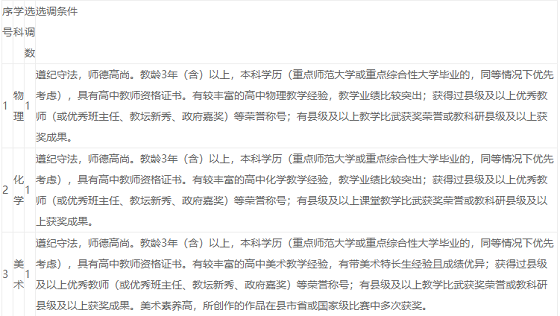 為優(yōu)化淳安中學(xué)師資隊伍,保障淳安中學(xué)實現(xiàn)可持續(xù)發(fā)展,經(jīng)局黨委研究同意,淳安中學(xué)特面向全縣中小學(xué)擇優(yōu)選調(diào)學(xué)科教師。具體情況見下表。請符合選調(diào)報名條件的教師自行向淳安中學(xué)辦公室報名。報名時請準(zhǔn)備一份詳細(xì)的自薦材料(含各類獲獎證書復(fù)印件)。聯(lián)系人:童珊;聯(lián)系電話:15968183638;報名截止時間:2020年8月23日17:00時止。逾期作自動放棄處理。