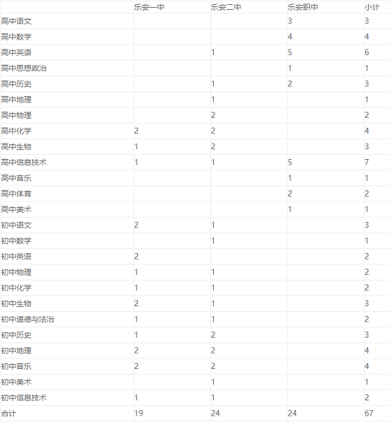 2020年,我縣計劃招聘樂安一中、樂安二中和樂安縣職業中學編外合同制教師67人,具體如下: