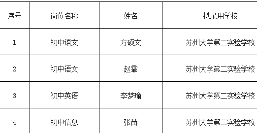 根據(jù)《2020年蘇州大學(xué)第二實(shí)驗(yàn)學(xué)校補(bǔ)充招聘年金制教師簡(jiǎn)章》規(guī)定,經(jīng)公開報(bào)名、筆試、面試、政審、體檢等程序,擬錄用以下4位同志為相城區(qū)年金制教師,公示時(shí)間為7個(gè)工作日(9月1日—9月9日)。