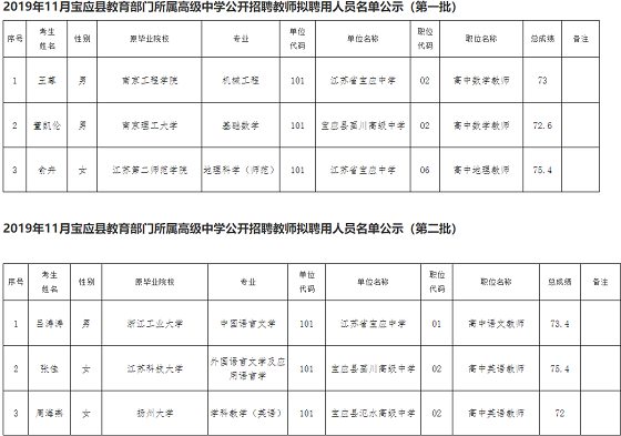 2019年11月揚州教師招聘 寶應縣教育部門所屬高級中學公開招聘教師擬聘用人員名單公示(第一、二批)