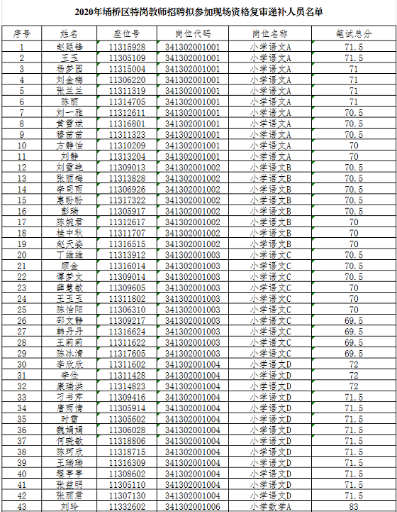 因部分崗位資格復(fù)審考生未按要求提交材料及放棄等原因,按照《安徽省2020年農(nóng)村義務(wù)教育階段學(xué)校教師特設(shè)崗位計劃招聘公告》規(guī)定,現(xiàn)對招聘崗位空缺名額予以遞補(bǔ)(名單附后)。