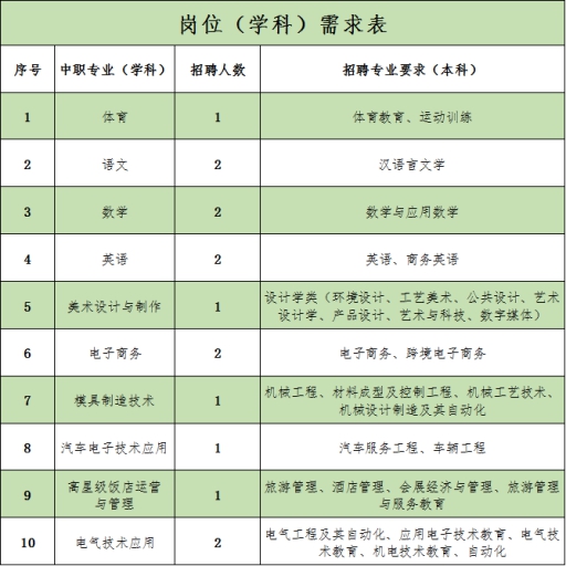 我校2020年招聘臨聘教師15名,待遇執(zhí)行三水區(qū)公辦中等職業(yè)學(xué)校臨聘教師工資標(biāo)準(zhǔn)。崗位(學(xué)科)需求如下: