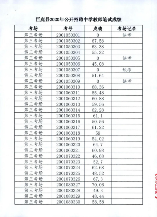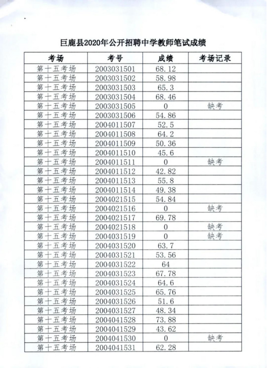 河北邢臺巨鹿縣2020年公開招聘中學(xué)教師筆試成績公示