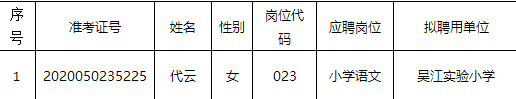 根據(jù)《2020年蘇州市吳江區(qū)教育系統(tǒng)第二次公開招聘教師簡章》,經(jīng)過考試、體檢、考核(政審)等程序,以下擬聘用人員予以公示。