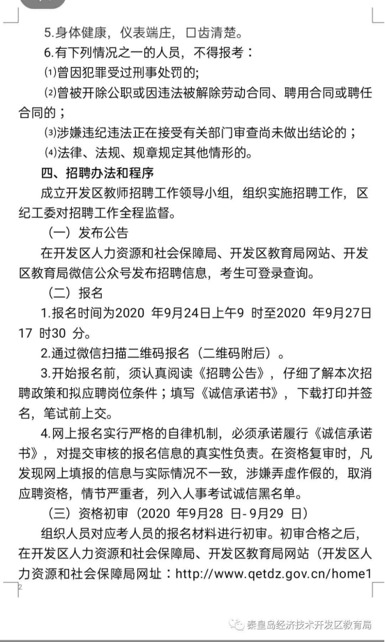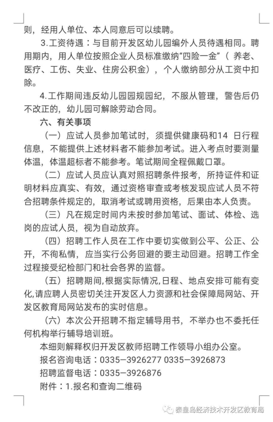 2020河北秦皇島開發區招聘學前專業技術崗位人員公告【52人】 文武教師溫馨提示:近期文武教師網收到舉報,有詐騙分子發布虛假信息,進行騙取報名費,如信息中涉及報名收費,請各位老師謹慎鑒別,確認無誤后再繳費報名,以免上當受騙,一般教育局組織的招聘才需要支付費用,學校招聘不需要支付,文武網所提供的所有考試信息僅供參考,敬請考生以權威部門公布的正式信息為準。 歡迎加入河北教師考編群,群號:499706398,考情、招聘信息早知道