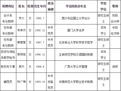 2020南寧教師招聘 廣西金融職業技術學院第一批公開招聘非實名人員控制數工作人員擬聘用人員名單公示(第二批)